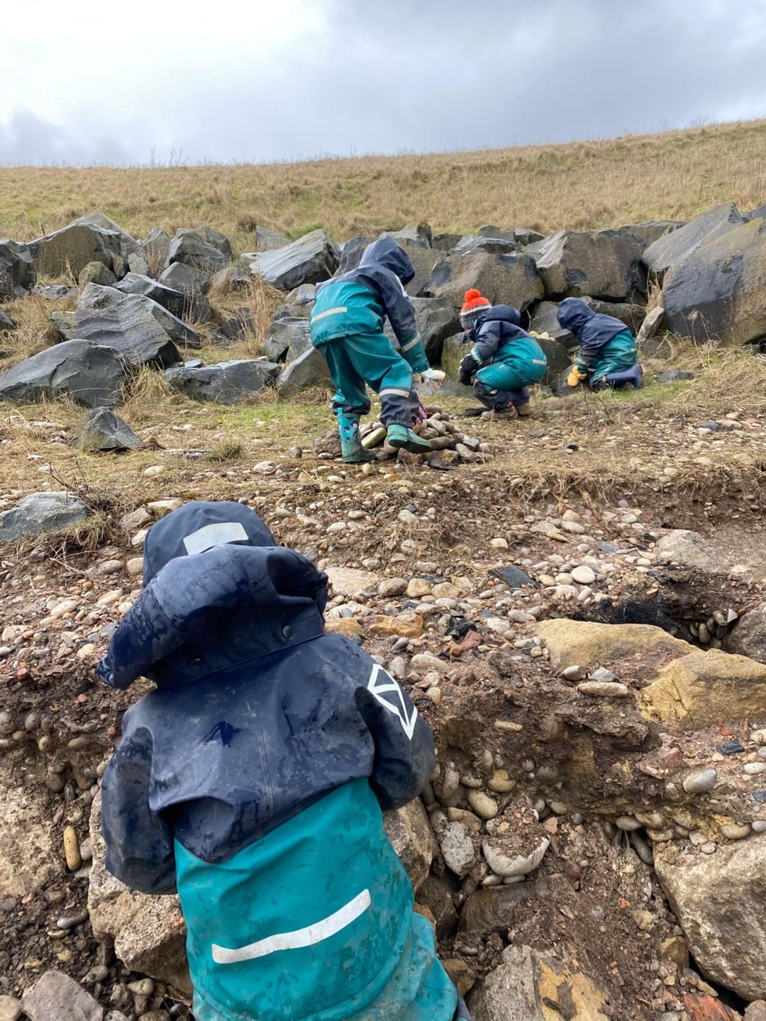 waterproof jackets and boots, digging and examining rocks in an outdoor rocky landscape with a hill and cloudy sky in the background.